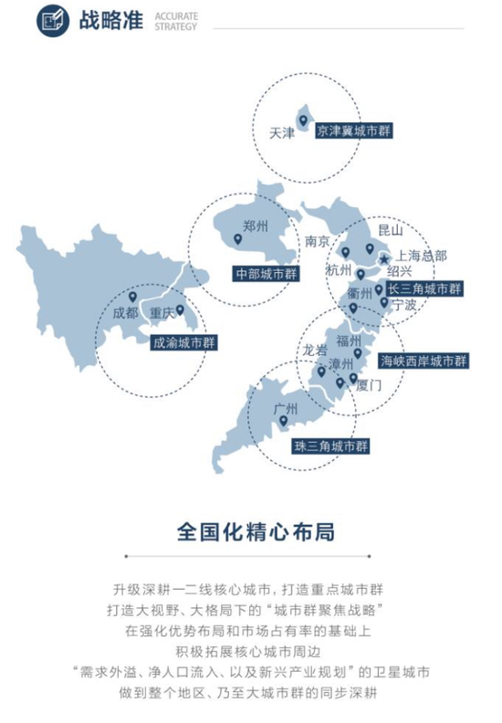 融信中国去年初登陆联交所主板,短短18个月左右,公司的资产规模已实现翻倍的增长,业务复盖区域亦从海西地区,走向全国,截至6月30日,融信中国的土地储备达到1301万平方米,复盖全国18个城市。资产规模和业务规模的高速增长,实有赖于公司“1+N”的精准战略布局。