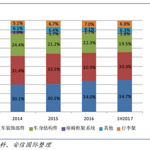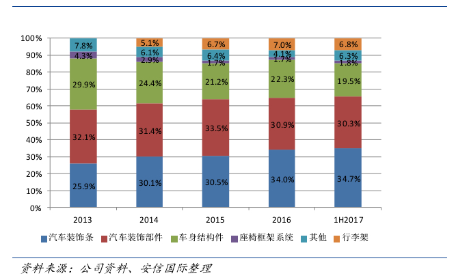截至 2017 年上半年,公司主营业务的产品汽车装饰条、装饰部件、车身结构件、座椅框架系统、行李架和其他产品。分别占收入的34.7%、30.3%、19.5%、1.8%、6.8%和6.3%。