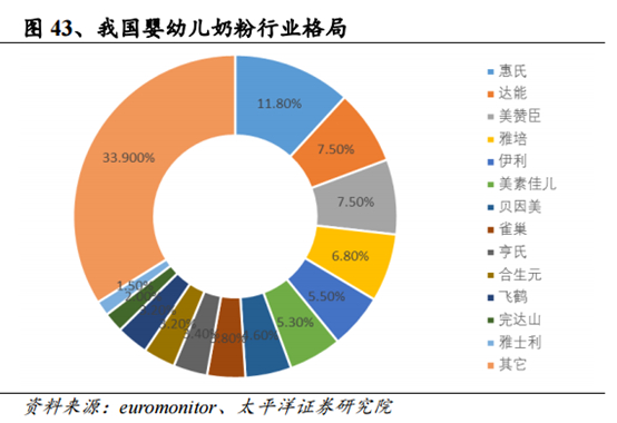 我国婴幼儿奶粉行业集中度较低,2016年最大五个企业市场占有率仅为39.1%,低于全球平均水平56.4%。国内奶粉企业、品牌、配方数量众多,杂牌和贴牌更是云集,目前我国通过注册的,生产企业共有 180家,却有 2000 多个品牌系列。而进口奶粉也占据半壁江山,2016年进口品牌份额为42.7%,而国产品牌市场份额仅为20%。