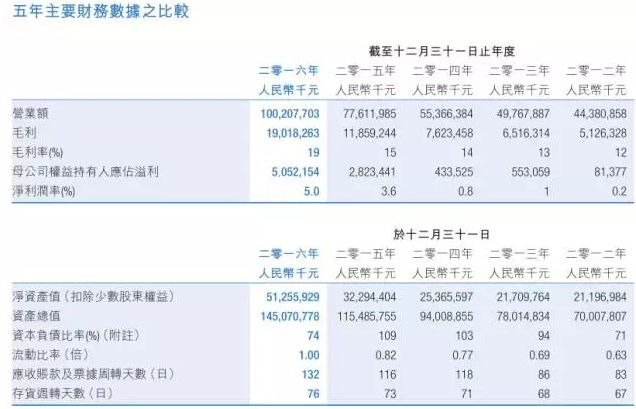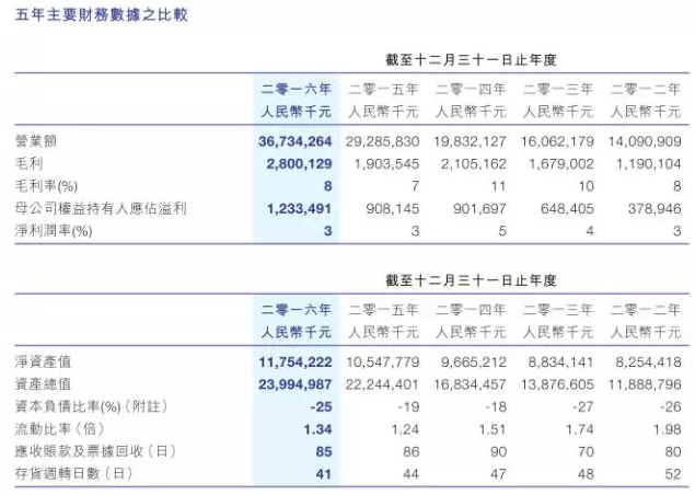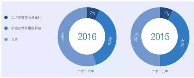 而在2016年中,其营收为1002.08亿元,同比增长29.11%,其中汽车及相关产品业务的收入约人民币550.22亿元,同比上升41.32%;手机部件及组装业务的收入约人民币380.83亿元,同比上升15.65%;二次充电电池及光伏业务的收入约人民币71.03亿元,同比上升23.53%。三个业务占本集团总收入的比例分别为54.91%、38.00%和7.09%。