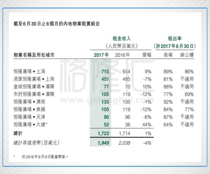 恒隆未来在内地的新物业大部分将在2019年落成,其中昆明恒隆广场将在2018年第四季度开业,武汉恒隆广场将在2019年年底开业。另外,重新优化的上海港汇恒隆广场计划在2019年竣工。