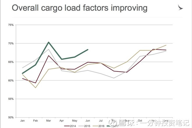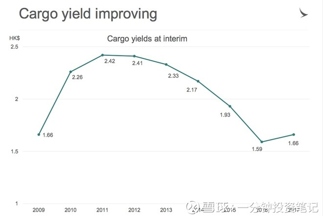 不过黑暗之中仍有一线希望,就是今年国泰的货运业务开始复苏。下图中可以见到货运业务收益率,经历近五年的下跌后开始触底回升。