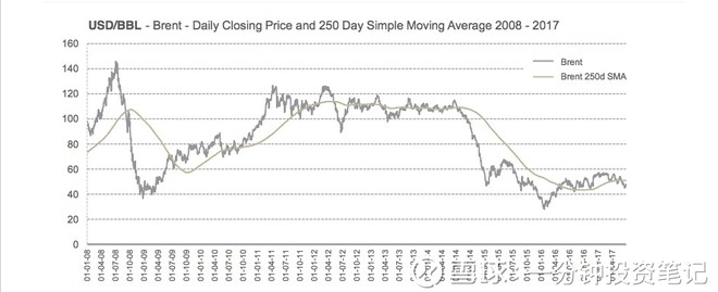 在国泰的情况下,就算公司声称对冲操作情况多复杂(例如买卖不同价格的期权、比例及时期,同时进行 short call 及 short put 等),也不会走出这两条基本规则。然后,我们先看布兰特油价: