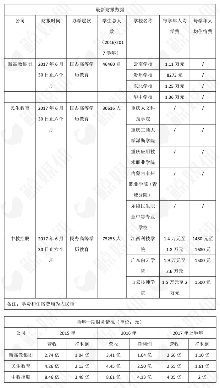 2.截至2017年6月30日,民生教育学费收入达2.36亿元,住宿费用1841.5万元,共计2.55亿元。
