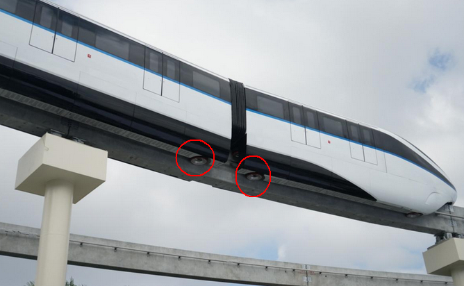 以比亚迪云轨为例,我们可以看到该云轨在悬横柱上运行,最下面的轮子为稳定轮,而按照云轨的运行模式,应分有三类轮子,分别为走行论,位于横柱上方运行,导向轮,位于横柱侧面运行,而稳定轮则位于侧下方运行。因为承重的关系,云轨的车载重量要比轻轨和地铁小得多,这也导致了该车型车辆编组要相对少。