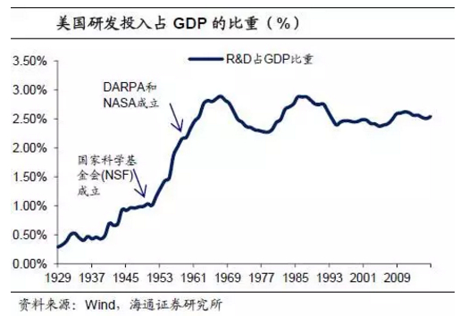 从供给端来看,同一时期美国的经济结构也在逐步优化。一方面,美国的研发投入奠定了美国科技强国的基础。1950年以来,随着美国国家科学基金会(NSF)、国家航空航天局(NASA)和国防高级研究计划局(DARPA)的先后成立,美国研发投资占GDP的比重从1950年的1%持续上升到1967年的2.9%。当时以军方需求为主的半导体和航空航天技术的资金投入保证了美国的相关技术一直处于世界领先地位。