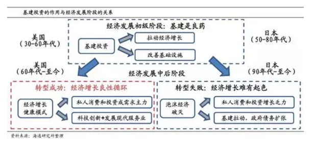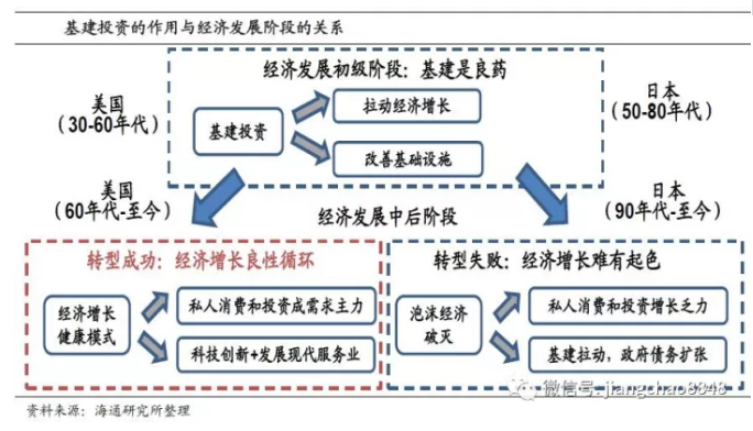 基建拉动经济,良药还是陷阱?基建投资作用的好坏取决于经济的发展阶段。在经济发展的初级阶段或者危机时期,基建投资有一箭双雕的作用。但是当经济发展到中后期,美国和日本的分化其实反映了两种经济增长模式。美国依靠对研发的投入和大力发展现代服务业,经济结构得到优化,并形成了私人消费和投资拉动经济增长的良性循环机制。相比之下,日本的经济缺乏内生动力,房地产泡沫的破灭导致日本失去了经济成功转型的机会。基建投资的增长不仅没有带动经济复苏,反而暴露出了一系列问题。