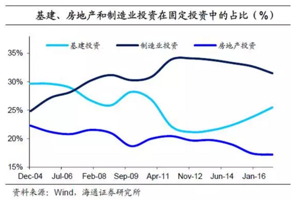 对于我国来说,基建投资一直是经济增长的主要动力之一。2012年以来,我国基建投资同比增速一直维持在20%左右,远高于房地产投资和制造业投资。在民间投资持续疲软的情况下,以政府主导的基建投资成为我国固定资产投资主要的增长来源,投资占比也从2012年的21%持续上升到2016年的25%。