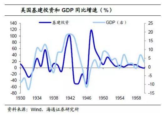 依靠基建投资,美国经济也成功从大萧条的泥沼中重新复苏。罗斯福当政时期,民间资源保护队(CCC)和工程进度管理局(WPA)大量雇佣失业工人进行学校医院以及公路桥梁的建设和维护工作。受到基建投资的带动,美国的失业率出现大幅下降,同时GDP同比增速在1934年就由负转正,达到10.8%。