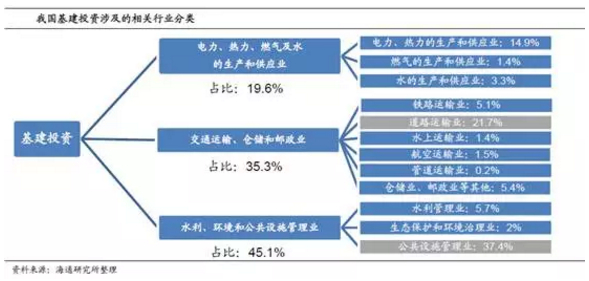 基建投资对经济增长的作用分为两个方面。一方面,基建投资能够拉动经济需求。基建投资是固定资产投资的重要组成部分,其主要涉及公共设施、交通运输设施以及电力热力设施的建设和管理。再进一步考虑到上游行业,基建投资还会直接带动建筑业、装备制造业以及建材行业(钢铁、水泥、有色)的需求。另一方面,基础设施的改善有助于经济的长期发展。所谓要致富先修路,一国的基建设施水平要符合当前的经济发展阶段,否则就有可能制约经济的长效增长。