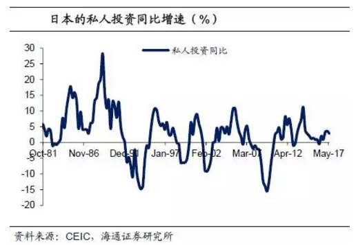 与美国经济回暖相比,日本自90年代危机以后经济就难有起色,其主要原因是经济缺乏内在动力。首先,日本私人消费一直持续低迷。1993年是日本消费变化的分水岭,1993年之前日本的消费同比增速与美国相当,一直维持在5%-10%的区间。1993年以后,日本的消费同比增速中枢下滑到0%。