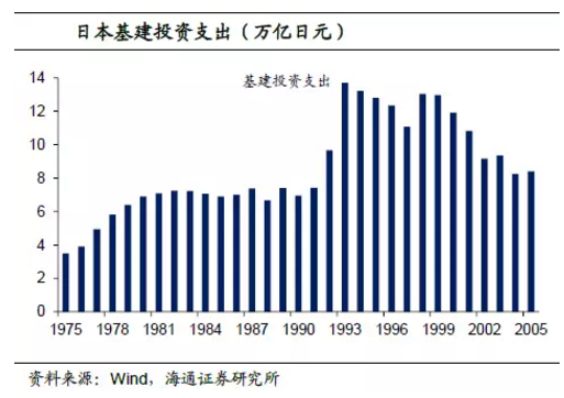 特别是在90年代房地产泡沫破灭以后,日本经济陷入了流动性陷阱,日本政府采取持续大规模的财政刺激政策。1993年日本公共工程的财政支出一度达到13.7万亿日元的历史最高值,直到2001年公共工程支出规模一直维持在10万亿日元以上。分细项来看,1993年日本的公共工程支出占财政支出的比重高达18%,基本接近社会保障支出和国家债务清偿的占比。
