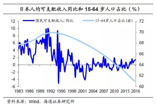 日本消费低迷一方面是因为日本的人口老龄化问题严重。日本15-64岁的人口占比在1992年达到69.9%的最高值以后持续下滑,目前已经降至61%。另一方面是因为经济疲软导致居民可支配收入增长乏力。和消费同比中枢下降一致,居民可支配收入同比增速也在90年代下降到0%左右。此外,房价下跌使得居民资产大幅缩水也抑制了消费需求。