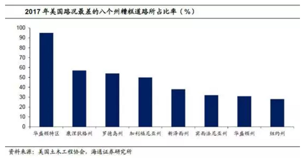 首先,美国的基建投资走弱并不是因为美国的基础设施建设已经达到饱和。美国的大部分基础设施建于上世纪30-60年代,目前大量设施老化严重。根据美国土木工程协会2017年的基础设施报告,美国的基础设施整体评级为D+,其中航空业、饮用水、公路和公共交通均处于极度不佳状态。根据协会的评估,美国到2025年之前需要投入4.5万亿美元进行设施维修和改善,而目前仍然有2万亿的缺口。