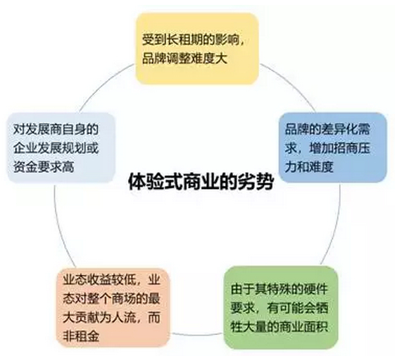 值得注意的是,在吸引人气的同时,体验型商业也有明显的劣势。例如,由于某些体验业态特殊的硬件要求,商场会牺牲大量的商业面积,从而导致租金收益能力差;此外,当体验式业态是主力商户时,一定程度上会增加招商的难度。