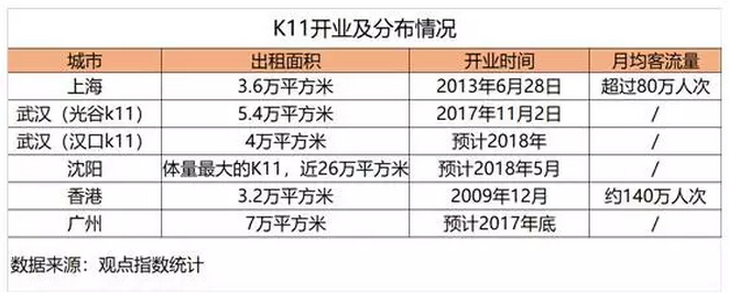 2017年11月2日,新世界在武汉迎来了第三座K11艺术购物中心,而据观点地产新媒体不完全统计,从今年年底到明年,广州K11、沈阳K11也将陆续开业。