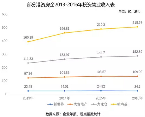 同样,在剥离了多个二三线城市项目后,新世界集团也选择加码商业地产。去年8月,新世界联合周大福以42.72亿拿下深圳前海桂湾片区商业地块,并拟斥资80亿元将该地块开发为金融及商业综合体;去年12月,新世界发展又与招商局蛇口工业区控股股份有限公司成立合营公司,以开发深圳市太子湾四块土地。