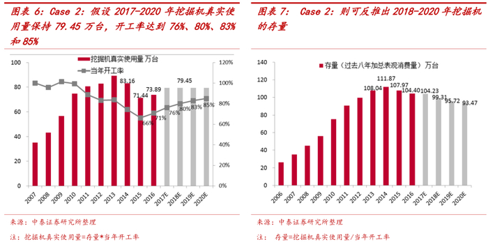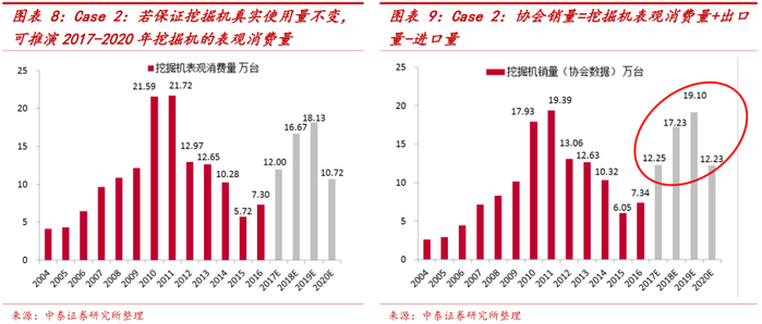 Case 2(中性):我们假设挖掘机寿命为8年,8年全部淘汰。如果保守假设2017-2020年挖掘机真实使用量不下降,为79.45万台,开工率达到76%、80%、83%和85%,则2018-2020年挖掘机的表观消费量需求将达16.7、18.1、10.7万台(挖掘机表观消费量=协会销量-出口量+进口量),可推演出2017-2020年挖掘机销量将达12.3、17.2、19.1、12.2万台。