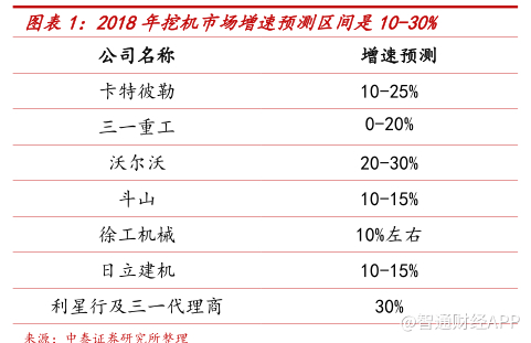 主机厂家对2018年挖掘机增速的预测基本在10-30%之间。