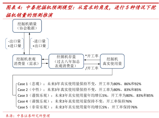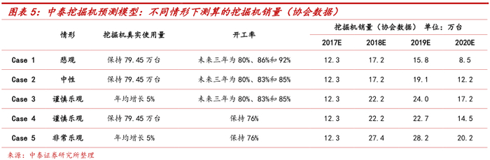 根据中泰挖掘机预测模型,我们假设了5种情形,测算未来3年挖掘机销量数据,我们对2018年、2019年挖掘机销量增长充满信心。其中第2种中性预测摘要如下。