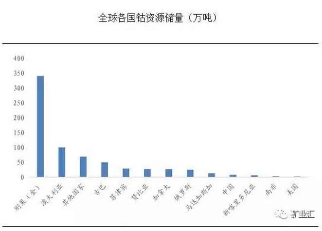 目前全球已探明的钴资源储量共计500万吨,其中65%分布在非洲刚果,其余35%分布在世界其它地区。