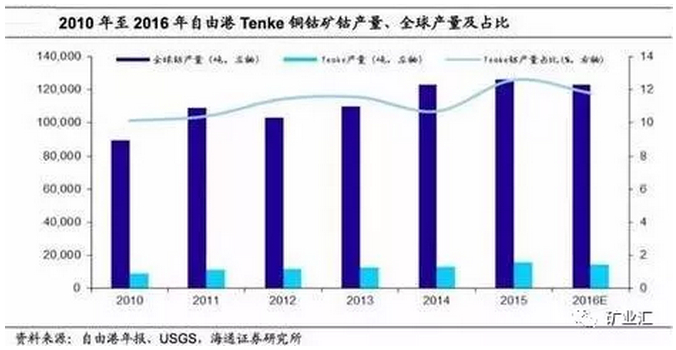 钴矿目前全球年产量大概10万吨,其中嘉能可2.8万吨,洛钼1.6万吨,欧亚资源0.7万吨,三家占比50%。