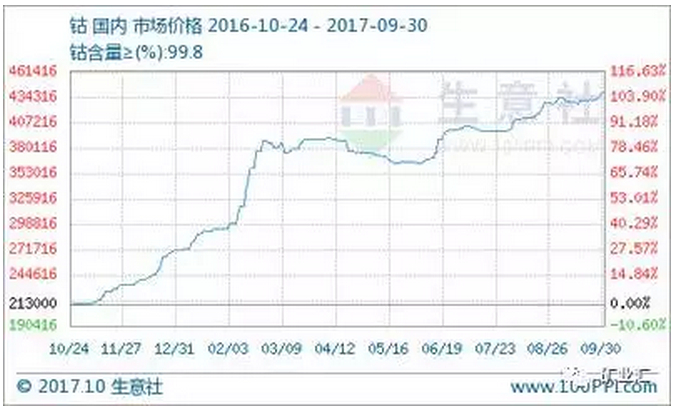 基于全球未来电动汽车确定性的爆发,目前市场上的钴资源已一钴难求。据中国有色金属网统计,年初以来,钴的价格涨幅最高达到75%;截止至10月30日,国内钴市场均价为446333元/吨,较年初上涨64.8%。