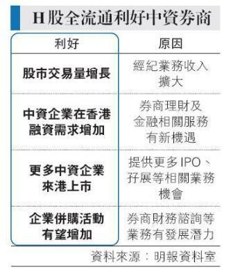 此外,更多中资企业来港IPO,以及日后中资企业在港进行投融资、并购等的需求量都会有显著增加,令券商除了经纪业务之外,无论是IPO、孖展,以至财务咨询、理财等金融服务方面的生意都有一定增长潜力,因此H股全流通若能落实,对中资券商亦属重大利好消息。