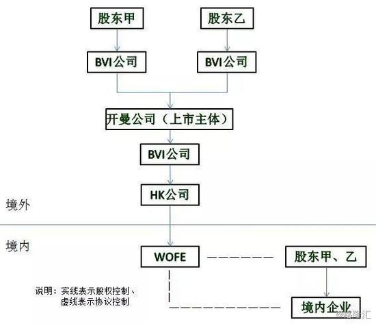 通常情况下,在VIE模式中,境外上市主体与境内企业的架构如下: