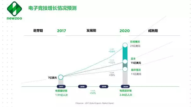 同时,电子竞技正在进入成熟阶段,未来的2年对于电竞多快能成长为几十亿美元的产业至关重要。这其中的决定性因素将会是本地联赛的成功、特许经营权的获得、常规化执行、游戏比赛模式的开发、内容销售权、团队盈利能力以及对行业的冲击,这包括从传统媒体、娱乐、电讯和体育公司等方方面面。这几个因素在接下来一两年的表现将决定电竞的增长速度,最乐观的情况是在2020年是达到24亿美元的规模,最低至少能达到15亿美元的规模。