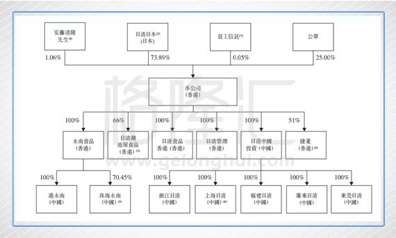 日清母公司持股比例为73.89%,董事长安藤清隆持股1.06%,员工持股比例0.05%,余下的25%由公众持股。