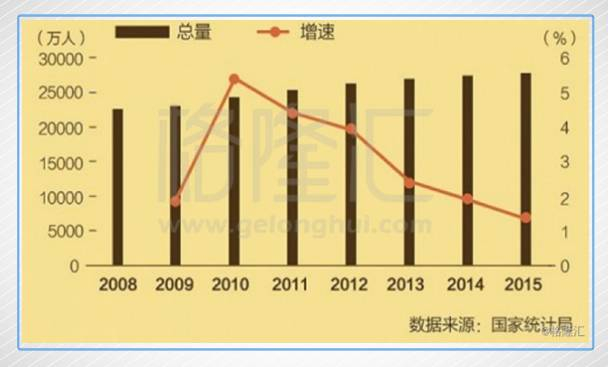 而农民工一直以来都是方便面消费的最大群体,下图我们可以看到自2011年开始,农民工的增速就开始下滑,2013年之后下滑速度更快,到了2015年,增速仅有1.3%。