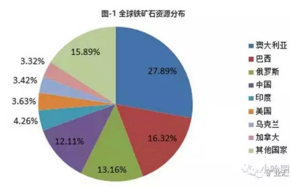 全球铁矿石储量主要集中在澳大利亚、巴西、俄罗斯和中国,四国储量之和占世界总储量的近70%。中国虽然铁矿石储量很大,但铁矿石品位低,含铁量不突出。