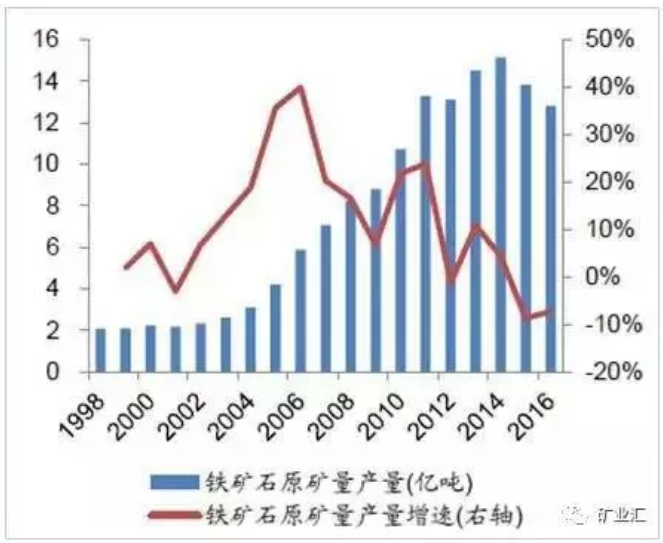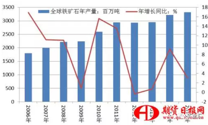 2016年世界铁矿石产量(世界平均品位)21.06亿吨。铁矿石的生产同分布一样比较集中,前四名国家(澳大利亚、巴西、俄罗斯和中国)的产量合计占全球总产量的70%以上。