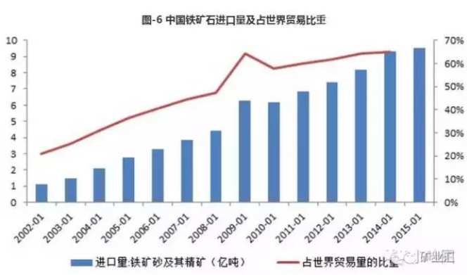 2016年,中国进口铁矿石10.24亿吨,同比增长7.5%,中国铁矿石对外依存度已超过89%。预计2017年这一数字甚至将超过90%,在大宗进口商品中位居第一位。