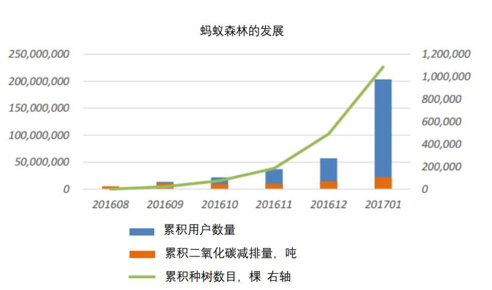 像王梦这样的蚂蚁森林用户有很多。蚂蚁金服在2016年推出的这款产品,短短一年多时间,累计用户达到2.3亿人,累计种树超过1025万棵,堪称以互联网速度发展。