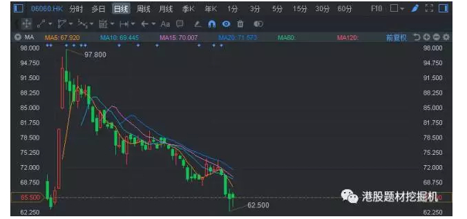 众安在线在K线上的表现可以说是三支中表现最好的,虽然上市后的两个交易日略微下跌,但是在随后的三个交易日的连续涨幅就超过40%。那么随后的走势就如上图所示了,并在昨天跌破了前期低点。