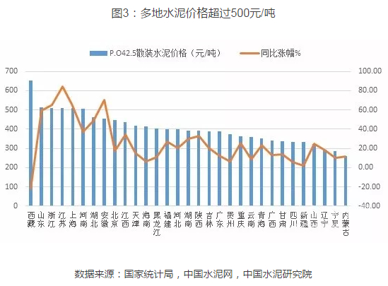 根据中国水泥网统计,除水泥价格传统高地西藏外,山东、浙江、江苏、上海、河南P.O42.5散装水泥均价均已经超过500元/吨,湖北、安徽、北京、江西等另外8个省市也超过400元/吨。与去年同期相比,江苏涨幅最大,同比上涨高达84%,常州、无锡、镇江、苏州同比涨幅超过90%,个别地区甚至同比有翻倍增长,上海、浙江、安徽同比涨幅超过60%,安徽部分地区涨幅也超过了90%。