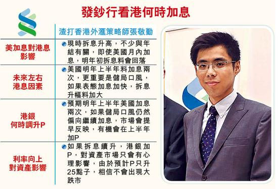 渣打香港外汇策略师张敬勤亦称,本港资金仍然相当充裕,即使美国月内再加息一次,相信HIBOR亦难跟足升幅。他认为,香港银行最快明年中会加P,预期美国明年上半年再加息两次,更重要的是联储局口风,‘如果表态加息加快,拆息升幅料加大,届时港银会有压力调升P,加幅为25点子(每100点子为1厘)’。