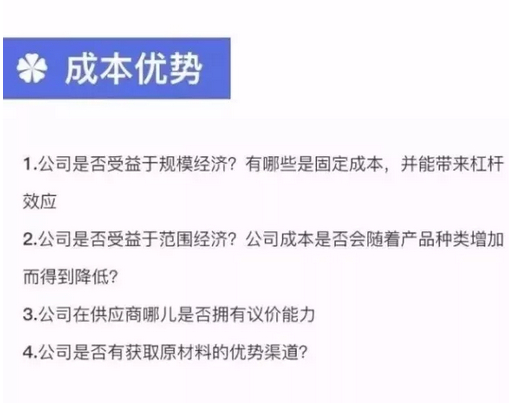 成本优势可能来自4个方面:低成本的流程优势、更优越的地理位置,与众不同的资源和相对较大的市场规模。