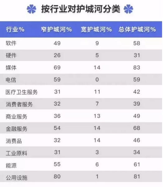 晨星公司检查了2000多家上市公司后发现,与硬件企业相比,我们更容易在软件公司里发现护城河。媒体行业强大的品牌和内容对渠道的掌控力,造就了媒体企业的竞争优势,如迪士尼。直接面对消费者的企业往往难以形成竞争优势,如餐饮和零售商,具有款护城河的消费服务企业是所有行业中最低的,他们的问题在于低转换成本,而经营理念却有益于传播和复制。但是好的企业并非不可实现(如星巴克)只不过不容易。相反面对公司业务的企业,则具有更高的护城河。他们容易把自己的业务跟企业客户的业务做结合,从而形成很高的转换成本。