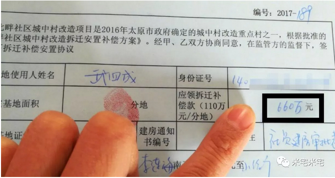 《山西“拆迁农户”一夜变土豪 660万补偿相当于200年收入》12月10日,山西太原小店区北畔村的武四成大爷晒着太阳,格外高兴,自从村里被列入城中村改造项目后,生活彻底发生了改变,拆迁领补偿,家家户户都成了500万元以上的土豪。一部分分给子女,留下100万,一年四五万的利息,也够老两口生活了。