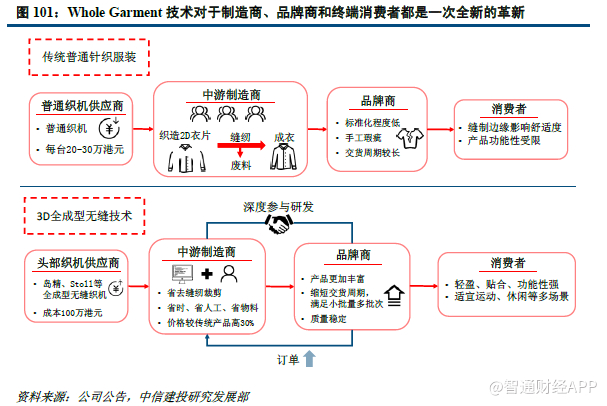以针织毛衣的制造为例,传统流程中织机织出的前身、后身以及袖子等衣片通过裁剪、缝纫等人工环节制成成衣,而日本岛精、德国Stoll 等织机制造商推出了全成型无缝针织机后,南旋控股率先采用全成型针织技术(Whole Garment),通过程序的设定,以整件状态、直接三位立体方式一次性编织出成衣、鞋面等产品。