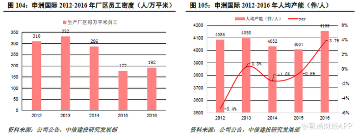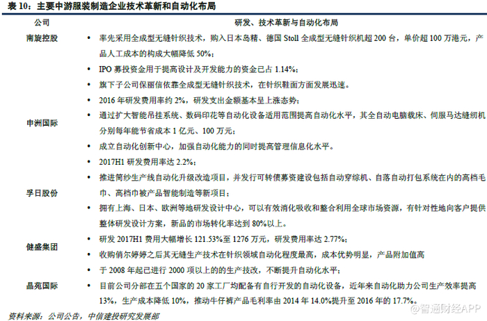技术革新的意义不仅在于带来新产品,还能够通过自动化水平的提高显著提升人效。以申洲国际为例,公司通过扩大智能吊挂系统、数码印花等自动化设备适用范围以及成立自动化创新中心,提高生产自动化与管理信息化水平,有效缓解人工成本上涨的压力。其全自动电脑载床、伺服马达缝纫机分别每年能节省成本1 亿元、100 万元。近年来公司通过提升自动化水平,生产效率和盈利水平明显提升,国内宁波工厂2017H1 实现人均生产效率提升约10%,柬埔寨、越南工厂也因自动化推动人均效率由去年的65%、50%提升至目前的70%、60%。