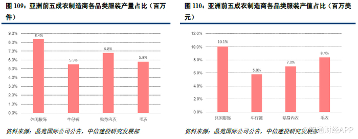 据Euromonitor 数据显示,作为主产区,全亚洲共有超过一万家规模以上的的成衣制造商遍布各个国家,主体仍位于中国。亚洲前五名成衣制造商服装产量(百万件)合计占亚洲整体仅2.3%,若以产值计算(百万美元)该比例为2.5%。从各主要品类来看,前五名成衣制造商产量和产值占比也几乎都低于10%,可见亚洲OEM 成衣制造市场格局仍高度分散。