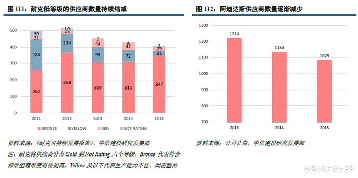 另一方面,部分下游品牌服装企业主动收缩生产供应商规模,优化供应商结构,向高品质供应商倾斜。快时尚品牌对供应商的严格择取是一方面,另外主要运动品牌也于近年对其供应商进行了调整,如两大龙头耐克和阿迪达斯。随着耐克加强供应商的监管以及提高透明度,耐克服装供应商数量不断减少。2011-2015 年,耐克服装供应商数量从497 家减少到406 家,各品牌供应商数量下降的同时向优质供应商倾斜。而阿迪达斯于2015年提出未来5 年战略计划“立新”,以快速(SPEED)、聚焦中心城市(CITIES)和打造生态圈(OPEN SOURCE)为战略基石。其中一大举措就是精简供应商,供应商数量由2013 年的1214 家减少至1079 家。下游服装品牌公司主动整合其供应商基础,一定程度上加速了中游制造商整合的进程。