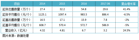 瑞丰动力的主要产品是缸体和缸盖,一般缸盖作为配套一起卖给需求客户,2017年上半年,该公司共出售缸体和缸盖数量分别为29.6万个和7.8万个,同比分别增长20.8%和-2.5%,缸体缸盖出售比例为3.8:1。以下为瑞丰动力历年缸体缸盖出售情况以及收入情况:
