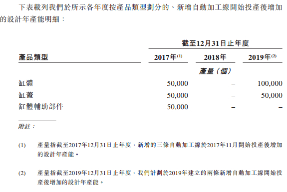 瑞丰动力最值得谈的便是它的智能生产计划,该公司在聆讯资料披露,自2015年12月起便开始设计及研发智能制造流程,并于2017年6月30日完成用于制造轻型缸体及缸盖的三条自动加工线,建立“智能工厂”网络平台。上述的三条自动加工线已于2017年11月份大量生产,按照计划2019年缸体增加的产能达10万个。