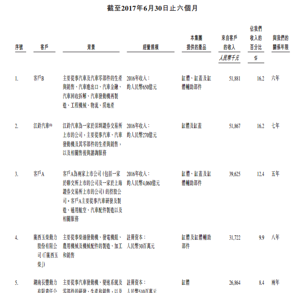 瑞丰的缸体客户包括江铃汽车、北汽福田、江淮汽车已经长城汽车等国内汽车制造商,拥有超过100多名客户。瑞丰的客户集中度较高,2017年上半年,该公司前5位客户贡献收入占比63.1%,有4名超过5年的客户关系,其中江铃汽车贡献收入16.2%的份额,客户关系7年,广西玉柴动力贡献收入9.9%,客户关系8年。