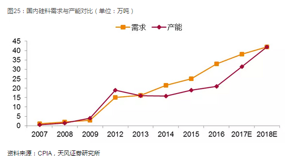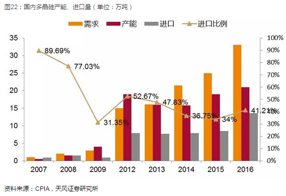 所以从2012年开始,国内硅料产能扩张速度很慢。随着国内下游需求崛起并迅速成为第一大需求市场,国内多晶硅产能与需求差越来越大。硅料价格开始上涨,厂商盈利能力好转,但对进口依赖一直很高,2016年多晶硅进口占比41.21%。